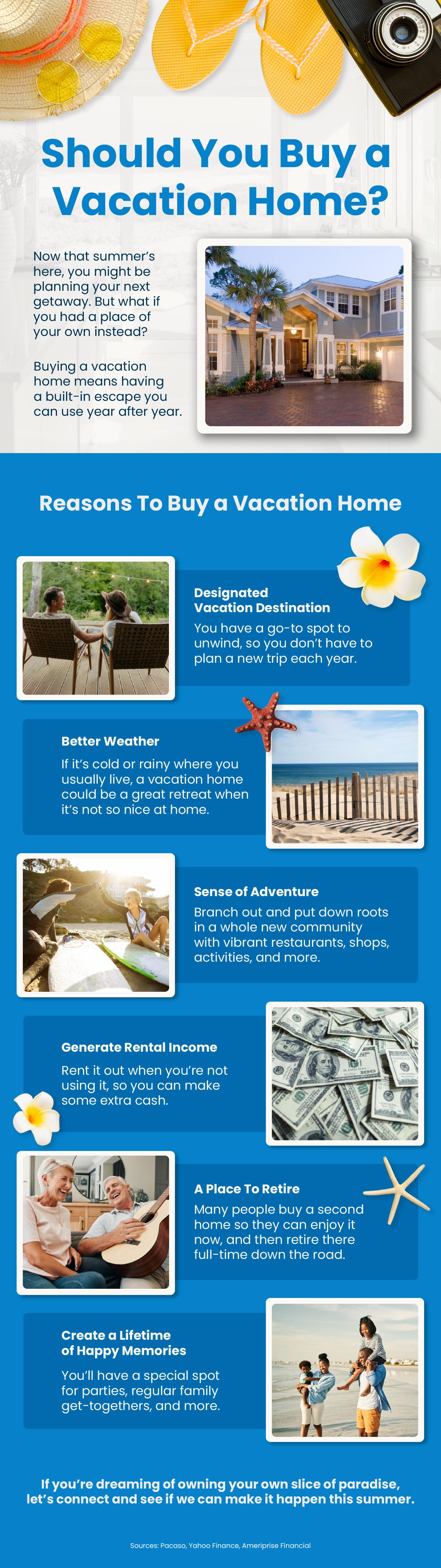 • Buying a vacation home means having a built-in escape you can use year after year. It gives you the chance to generate rental income and have a go-to retirement destination in the future.